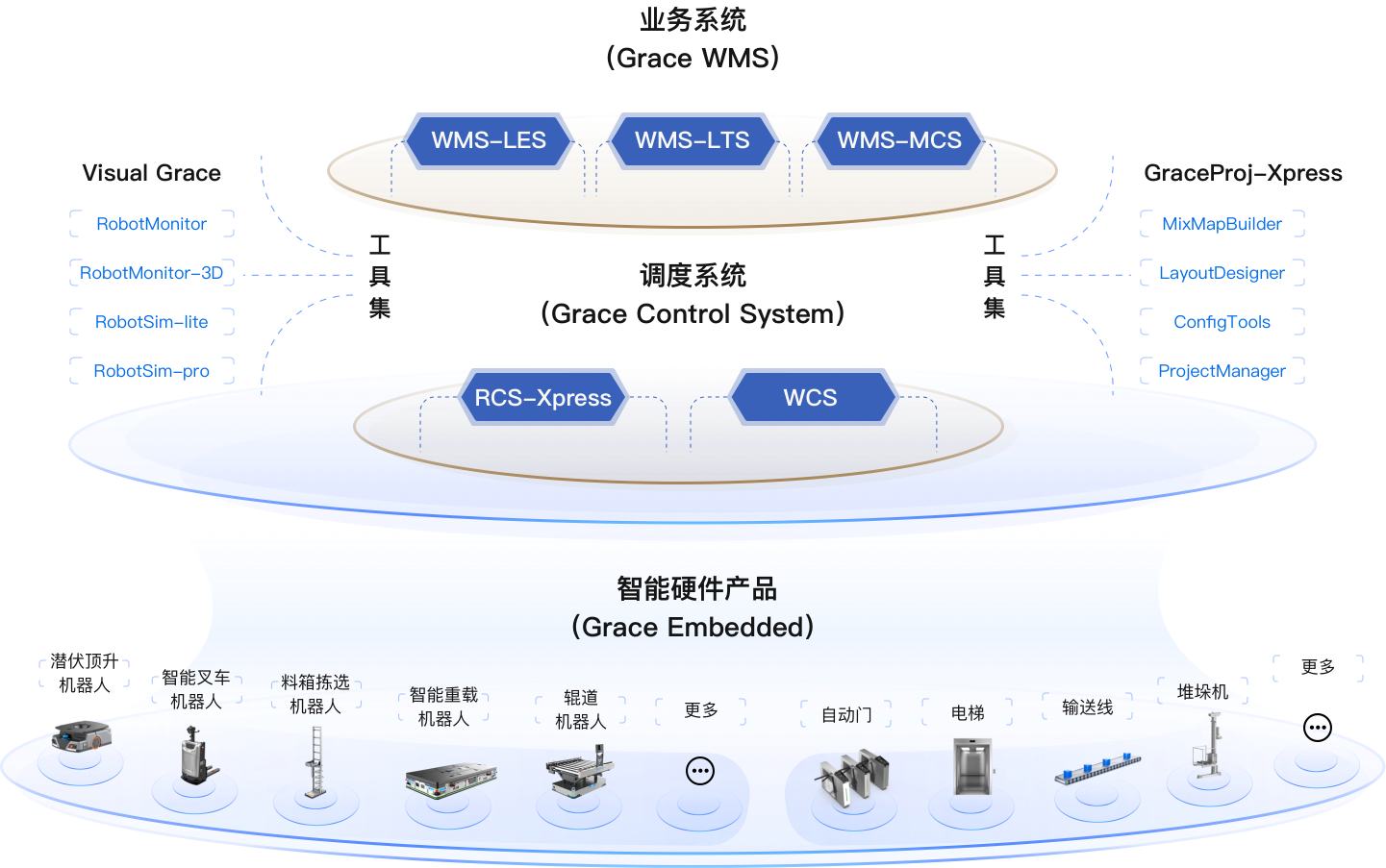 國自Grace智慧物流系統軟件平臺以調度系統(Grace Control System)為核心,集成WMS智能倉儲業務系統、 RCS調度系統和WCS設備控制系統三大核心平臺,廣泛應用于汽車制造、電商倉儲、光伏、工程機械等行業。 平臺可與企業上層系統和設備無縫對接,軟件功能擴展性強,可快速適配各種業務場景: 支持超大場景和多車型集群調度,實現物流搬運的高效均衡和穩定運行。
